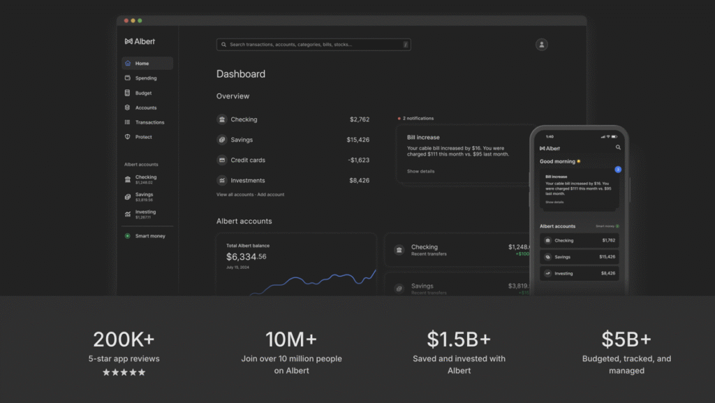 Több mint 10 millió ember által használt Albert több mint 50 millió tranzakciót nyomon követte. AzOkos pénz algoritmusÖsszeállítja az egyéni költségvetést, automatikusan megtakarítja a pénzt, és segíthet a befektetésben. A felhasználók akár 250 dollárig kaphatnak készpénzt.