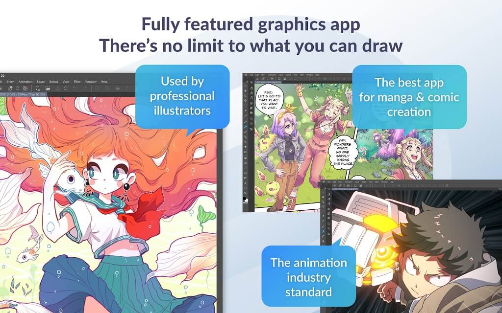A CLIP Studio Paint egy szinte profi osztályú művészeti alkalmazás, több mint 40 000 kefével és több száz funkcióval, hogy a művészet létrehozásakor előnyt nyújtson. Az alkalmazás támogatja a raszter és a vektor grafikát, valamint a 3D -s formátumok széles skáláját.