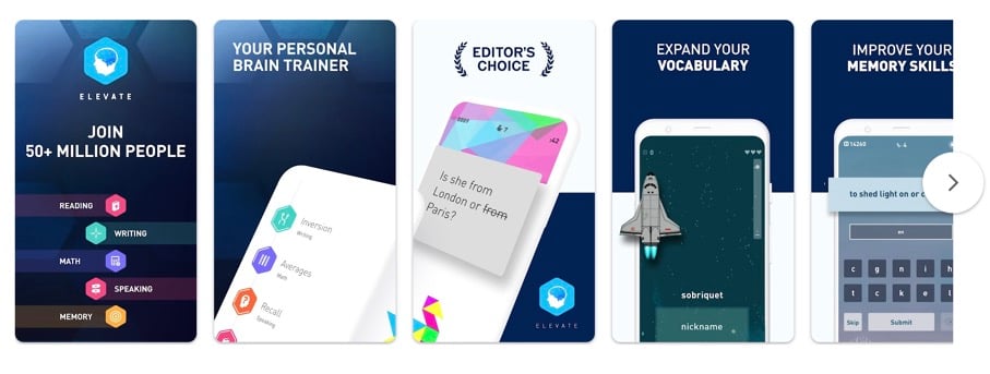 Az Elevate egy másik alkalmazás, amely arra törekszik, hogy javítsa az idősek kritikus kognitív képességeit. Ennek az alkalmazásnak azonban nincs korhatár, és mindenki felhasználhatja szakmai termelékenységének, tanulási képességeinek, mentális élességének, szókincsének és mentális agilitásának növelésére.