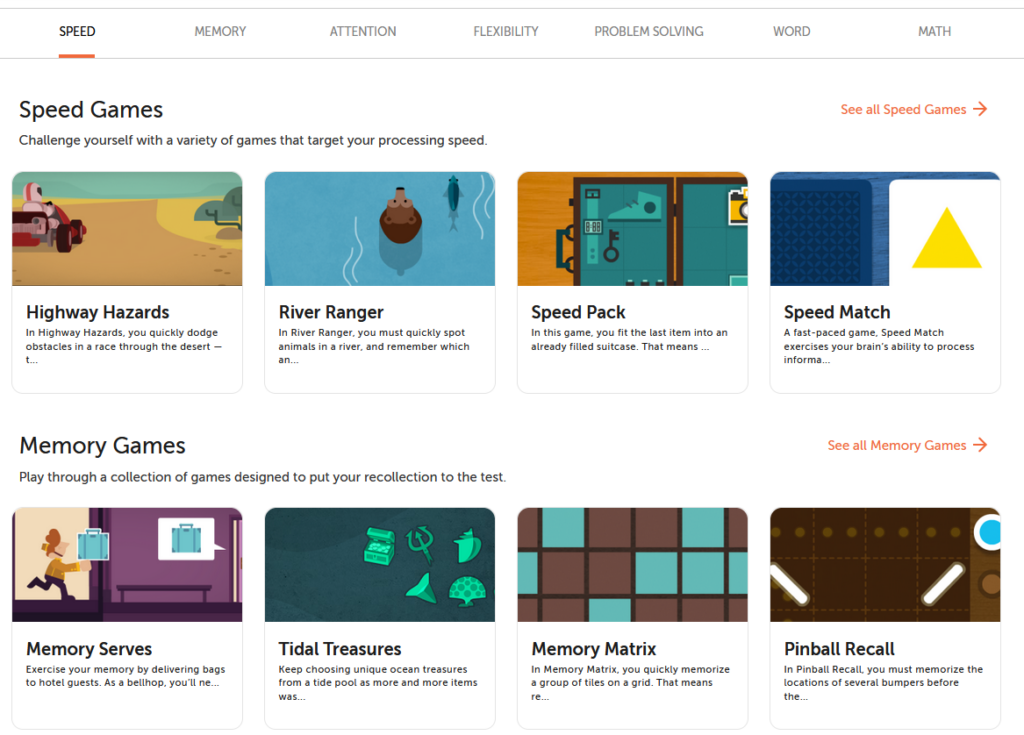 Az alkalmazáson belüli játékokat úgy tervezték, hogy megkérdőjelezzék a felhasználókat különféle kognitív feladatokkal, és segítsék őket feldolgozási sebességük, rövid távú memóriájuk és általános agyi energiájuk kiképzésében. Az elmejátékok lehetővé teszik a pontszámok nyomon követését, így mindig tudja, mely területeket kell javítania.