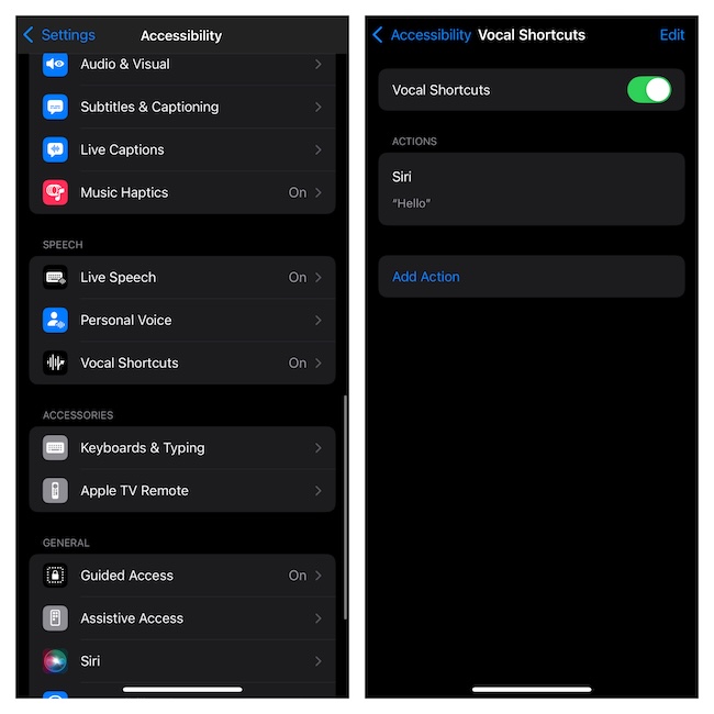 - A vokális parancsikon megszabadulásához nyissa meg a Beállítások> Hozzáférés> Vokális parancsikonok> Érintse meg a jobb felső sarokban található szerkesztés gombot.