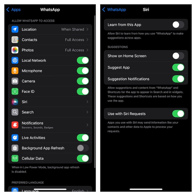- Például, ha a WhatsApp -ot szeretné használni a Siri -vel, menjen aBeállítások App> Apps> WhatsApp> Siri>Kapcsolja be a kapcsolót„Használjon Siri kérésekkel”.