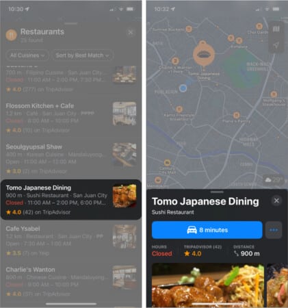 Érintsen meg egy éttermet a listában, vagy érintsen meg egy ikont a térképen, hogy további részleteket tudjon meg a helyekről, beleértve a távolságukat és a becsült utazási időt.