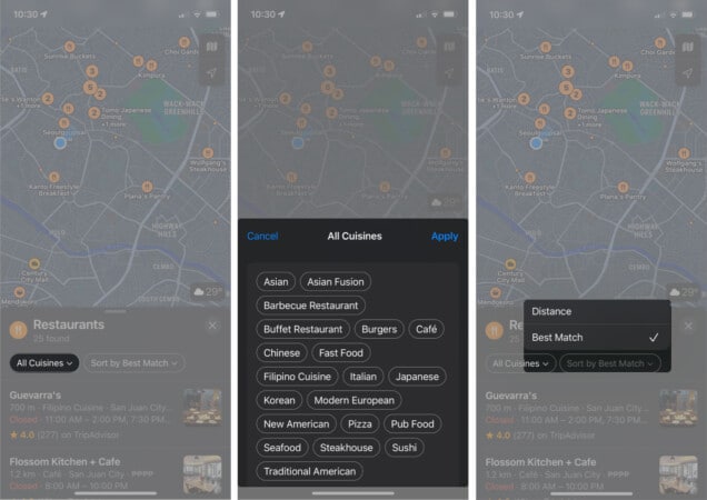 Ezután koppintson egy kategóriára, hogy megkönnyítse a keresést. Ha például egy közeli éttermet szeretne keresni, koppintson az Éttermek elemre. Ezzel az összes éttermet kiemeli a térképen. Használja a rendelkezésre álló szűrőket a keresés szűkítéséhez.