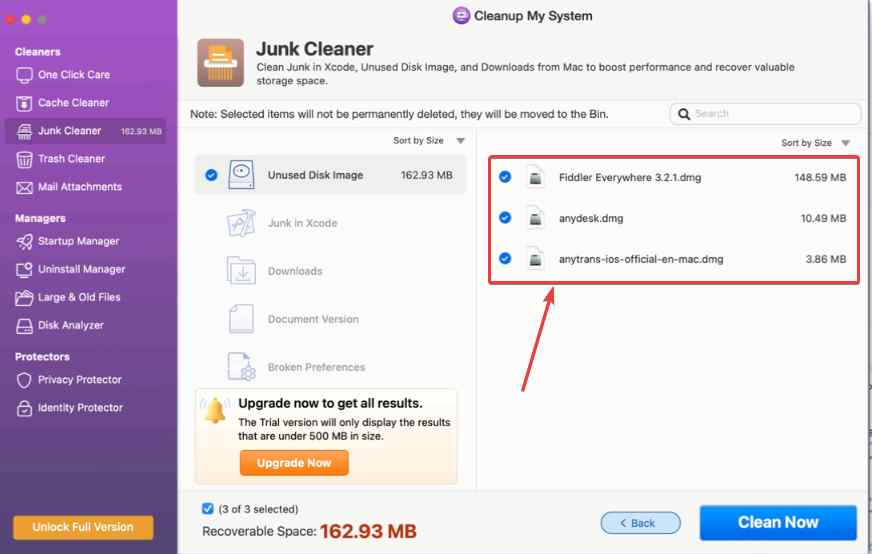 A telepített alkalmazások fel nem használt lemezképeitől való megszabaduláshoz használhat olyan alkalmazást, mint a Cleanup My System. Ez egy olyan alkalmazás, amely évekig hozzáadhatja a Mac életét azáltal, hogy javítja a teljesítményét és felgyorsítja azt. Bebizonyította, hogy hatékonyan javítja a kérdéseket, mint például„Az induló lemez szinte tele van”-