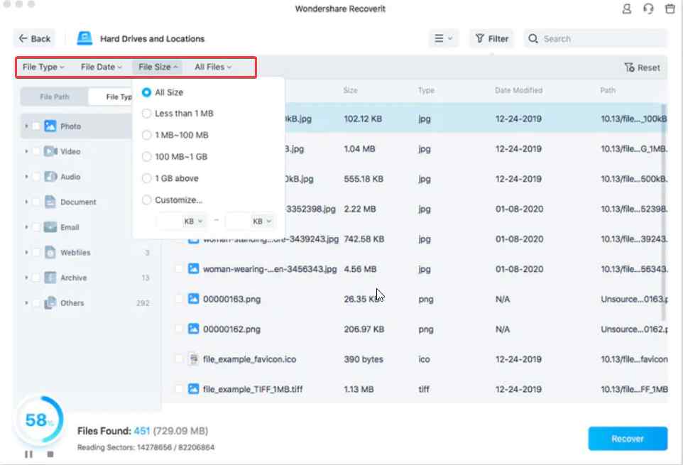 Tegyük fel, hogy törölte egy helytelen DMG fájlt, például egy olyan alkalmazás DMG fájlját, amelyet még nem telepített, vagy hogy még nem dolgozott. Hogyan kapnád vissza? Használhat olyan adat -helyreállítási eszközt, mint a WonderShare Recoverit for Mac -hez, és visszaállíthatja a véletlenül törölt DMG fájlt. Hogyan lehet helyreállítani az elveszett DMG fájlt a Wondershare Recoverit használatával? 1. Töltse le, telepítse és futtassa a Wondershare Recutionit -ot a Mac -en. 2. Bármikor, ha megtalálja az elveszett DMG fájlt, akkor szüneteltetheti a szkennelési folyamatot. 3. Még a fájlokat is kiszűrheti.