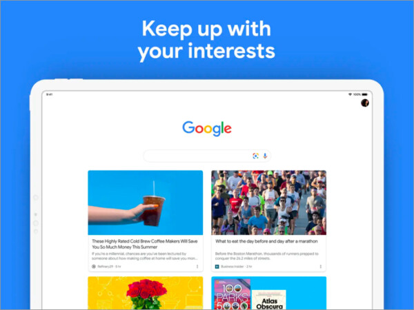 A Google alkalmazás iPaden való használatának másik előnye a személyre szabott élmény, kezdve a témákkal kapcsolatos frissítésektől a valós idejű frissítésekig az Önt érdeklő sportokról, filmekről és eseményekről.