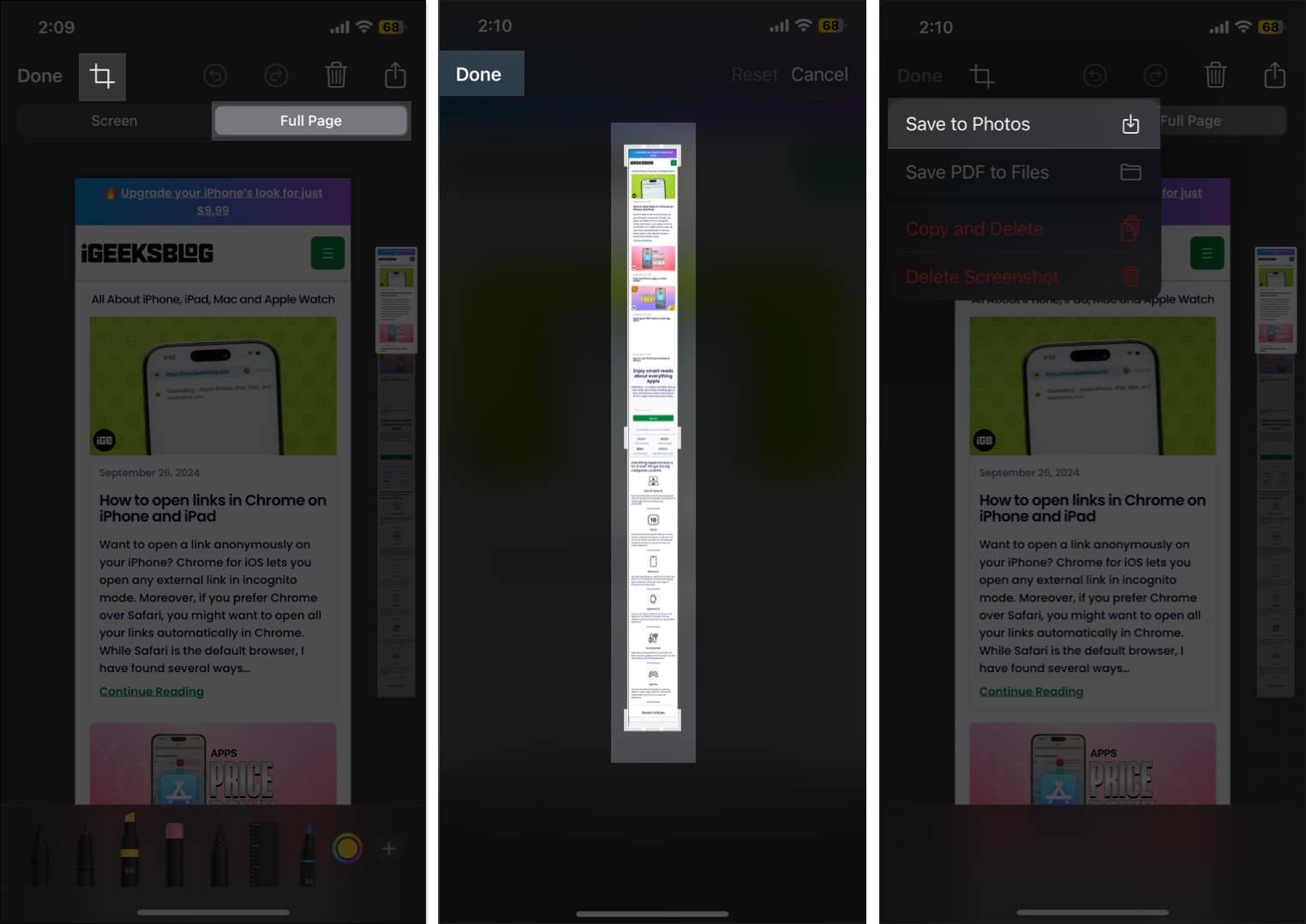 Készítsen egy normál képernyőképet, majd érintse meg a bal alsó alsó részén található előnézeti csempét, hogy felfedje. Ezután érintse meg aTele Oldaltab, majd koppintson az elemreKészA képernyőkép mentése.