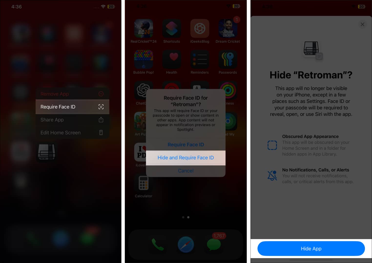 Az iPhone -on sok olyan alkalmazás található, amelyekben nem akarjuk, hogy mások hozzáférjenek, vagy akár tudják, hogy léteznek az iPhone -on. Míg az alkalmazások elrejtése vagy bezárása korábban nem volt lehetséges, az iOS 18 megvásárolta ezt a leginkább kért funkciót. Az alkalmazások bezárásához és elrejtéséhez az iPhone -on egyszerűen nyomja meg az alkalmazást → Koppintson az elemreFace ID -t igényel→ Válassza ki, hogy lezárja vagy elrejti -e az alkalmazást.