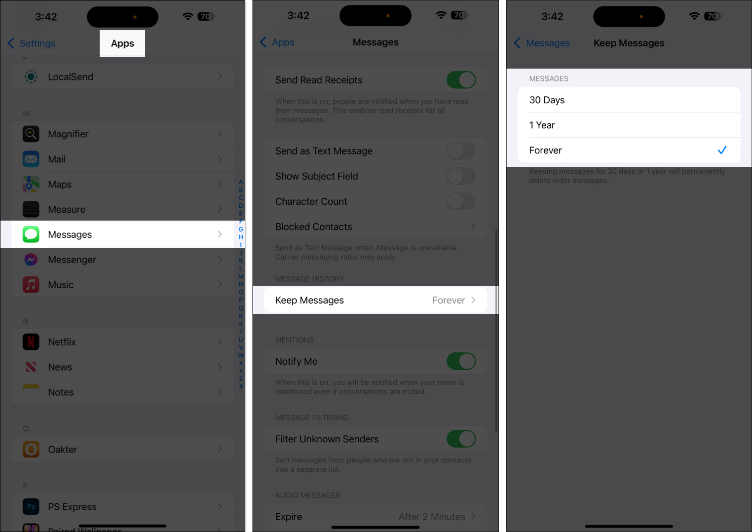 NyitottBeállítások→Alkalmazások→Üzenet→Tartsa az üzeneteket→ Válassza ki az időtartamot.