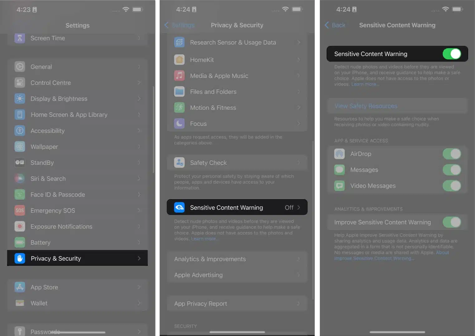 Az érzékeny tartalmi figyelmeztetés engedélyezéséhez lépjen a következőreBeállítások→Adatvédelem és biztonság→Érzékeny tartalom figyelmeztetés-