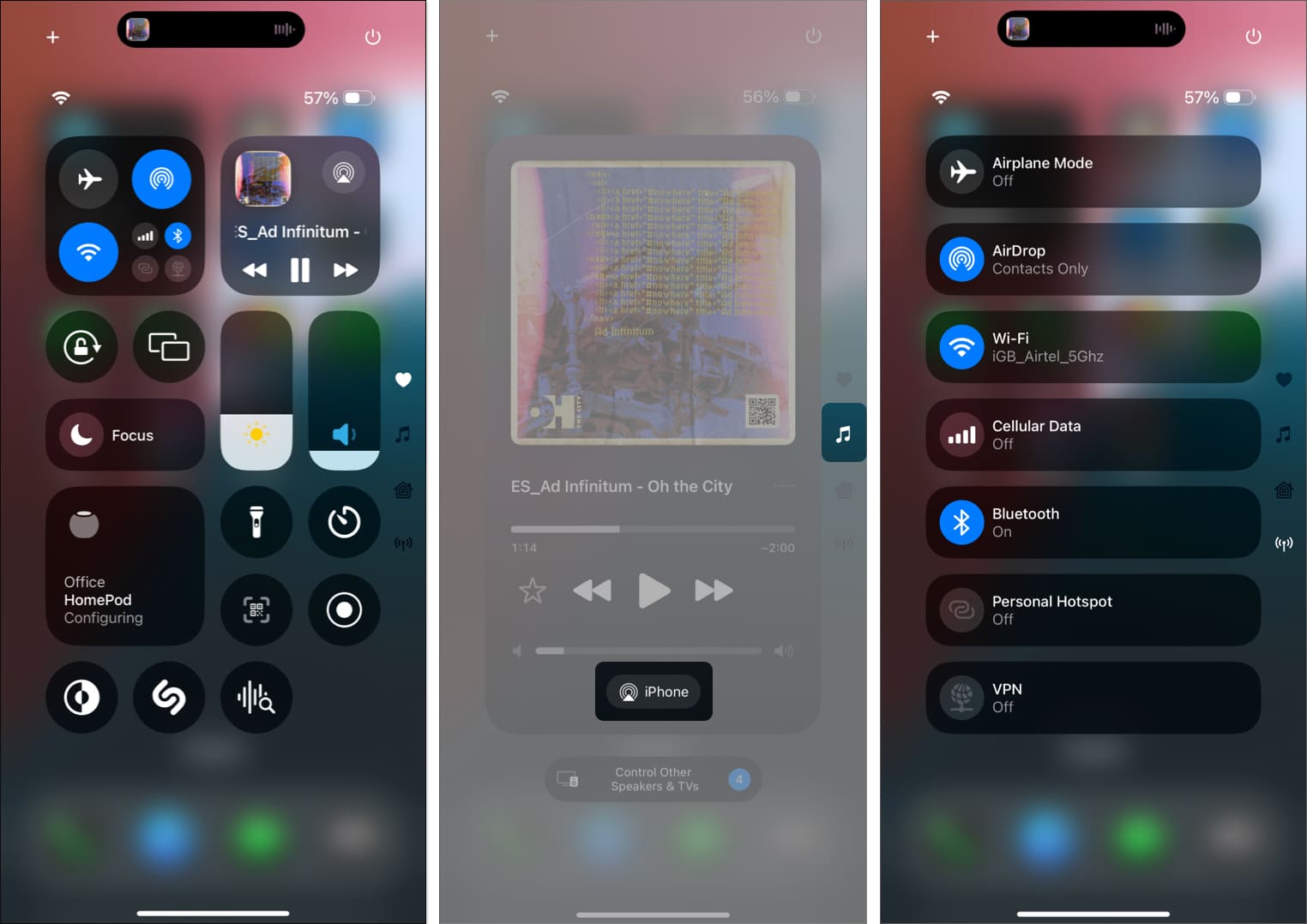 Egyszerűen csúsztassa le a kijelző jobb felső sarkát, hogy lehúzza az iPhone vezérlő központját. Itt gyorsan válthatWi-Fi,Bluetooth,Mozgó adat,Földre száll, és még sok más, csak egy diszplay gombbal.