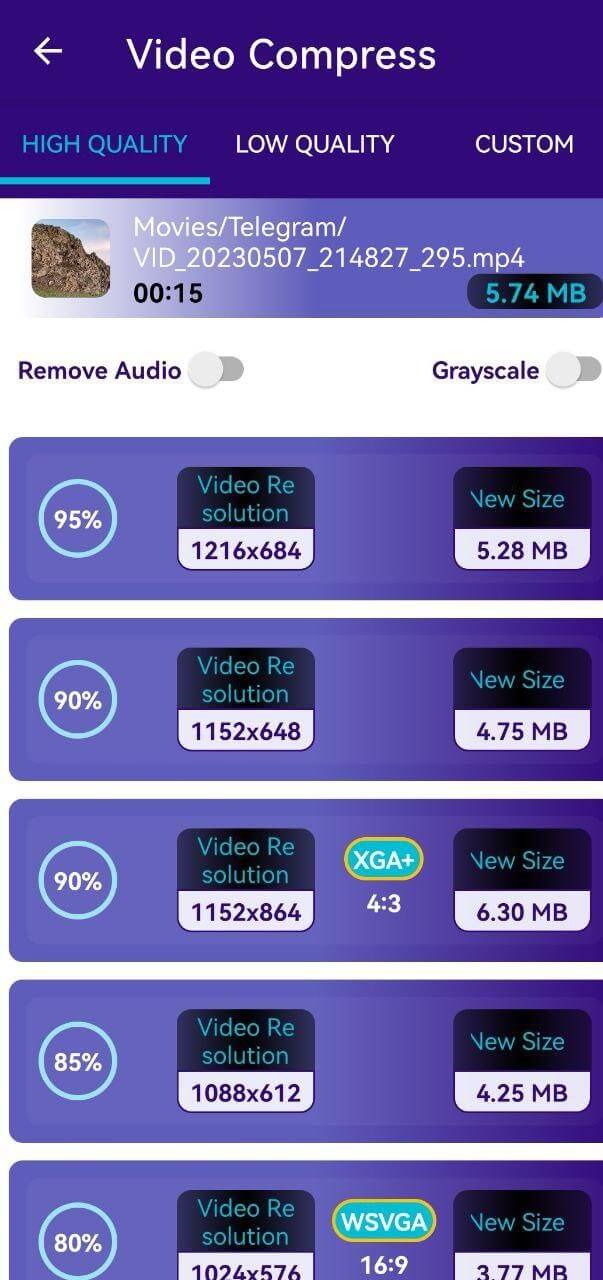 - Koppintson a Compress Video elemre, válassza ki a megadott presetek egyikét, és érintse meg újra a gombot.