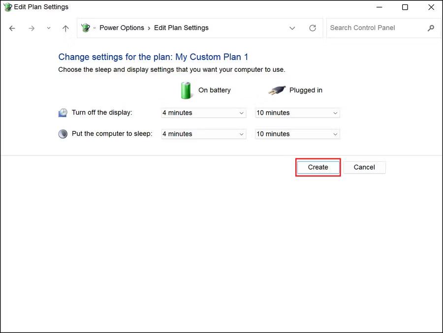 6. lépés:Válassza ki a Kiegyensúlyozott energiasémát, majd válassza a Létrehozás lehetőséget a Tovább gombra kattintva.