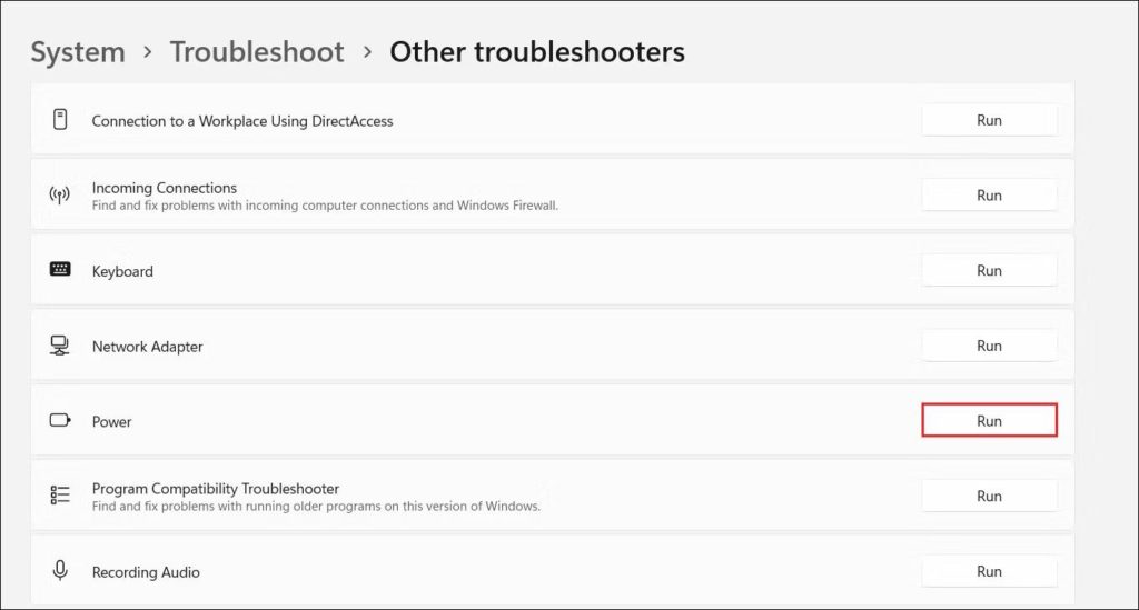 Előfordulhat, hogy az energiaellátási módok valamilyen korrupciós probléma következtében működnek a számítógépen. Ebben a helyzetben a lehető leghamarabb futtassa az áramellátási hibaelhárítót. Ez az eszköz úgy működik, hogy megvizsgálja a számítógépet a lehetséges problémák után, és a Windows beállítások Hibaelhárítás részében található. Ha hibát talál a rendszerben, figyelmezteti, majd megfelelő javításokat javasol. A hibaelhárító a következőképpen használható:
