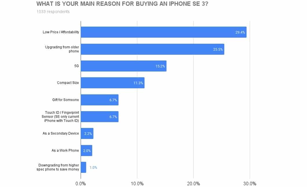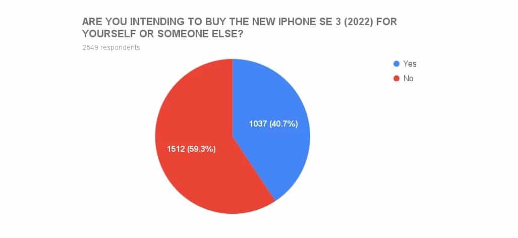 Ebből a 40% -ból az iPhone-felhasználók 24% -a azt tervezi, hogy a harmadik generációs iPhone SE-t vásárolja meg fő eszközként, míg a megkérdezett felhasználók 16% -a azt tervezi, hogy a telefont további eszközként vagy ajándékként vásárolja meg.