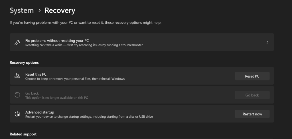 Ha az összes korábbi megoldás nem oldja meg az „MSVCR110.dll hiányzó” hibát a Windows 11 -en, akkor a Windows visszaállításának végrehajtása drasztikusabb, de hatékonyabb lépés lehet a rendszer funkcionális állapotba történő helyreállításához. Felhívjuk azonban figyelmét, hogy ez a folyamat eltávolítja a telepített alkalmazásokat és beállításokat, ezért a folytatás előtt ellenőrizze a fontos adatokat.