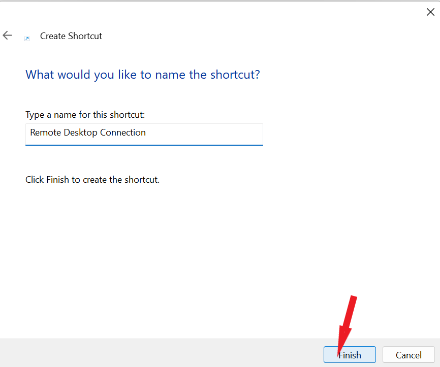 - Most írja beTávoli asztali kapcsolatamikor a parancsikon nevét kérik, és kattintson a Befejezés gombra