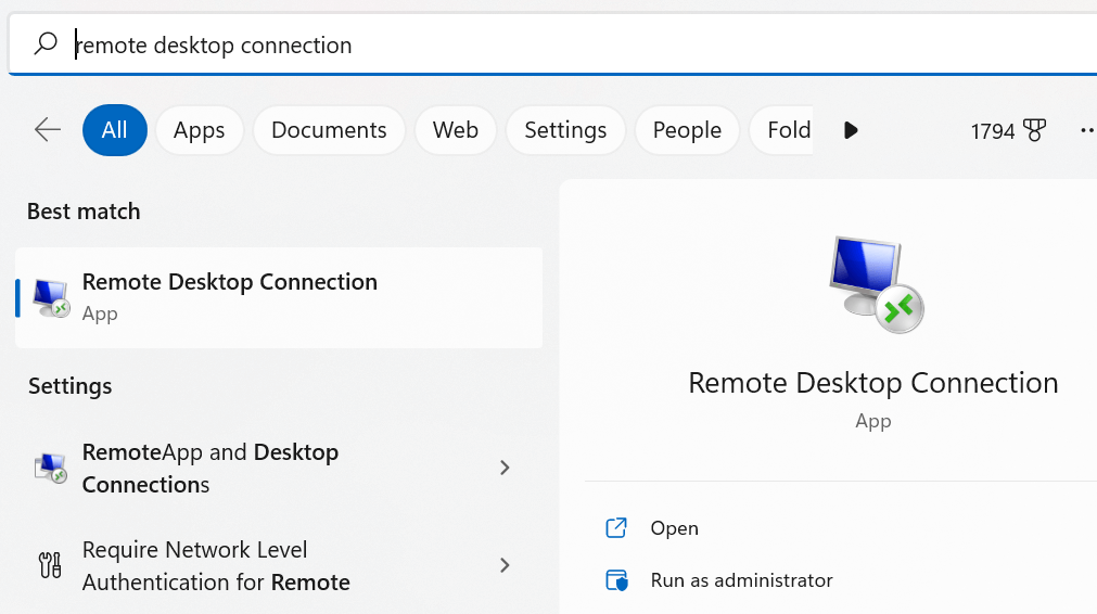 - Írja be"távoli asztali kapcsolat"a keresősávban.