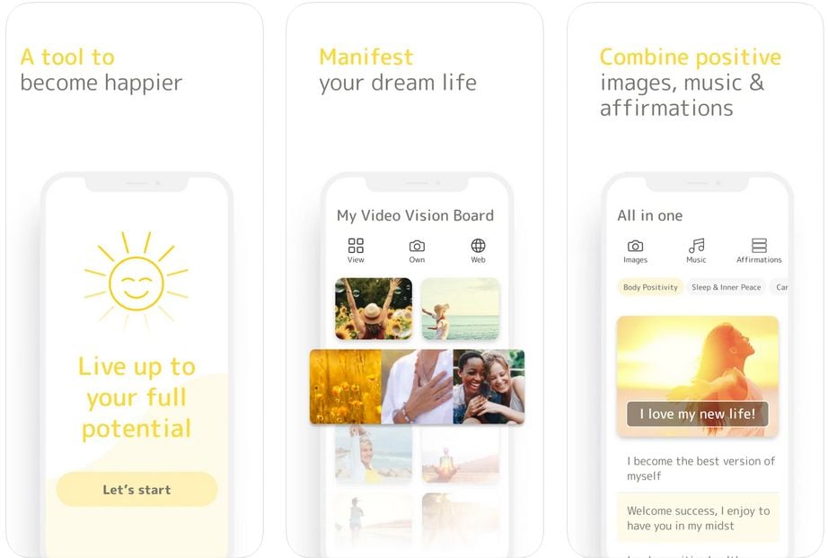 A tökéletesen boldog egy olyan alkalmazás, amely olyan funkciókkal teli, amelyek segítenek elérni a céljait és bízni a folyamatban. Először létrehozhat egy Vision Board-Video-t, ha képeket választ az alkalmazásból vagy a saját fényképeiből, célokat és megerősítéseket, és zenét adhat. Ezen felül hozzáférhet egy megerősítéshez és motivációs idézetek szakaszhoz, hogy segítsen magának a pozitív gondolkodáshoz. Van egy szakasz a naplózáshoz, mind a hála, mind a hangulat naplójával.