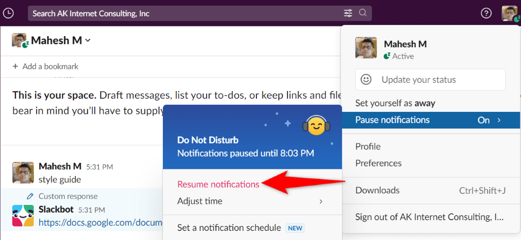 Az egyik oka annak, hogy nem kap Slack-értesítéseket, az az, hogy szüneteltette az értesítéseket az alkalmazásban. A Slack asztali és mobilalkalmazása kapcsolót kínál, amely lehetővé teszi a figyelmeztetések engedélyezését és letiltását.