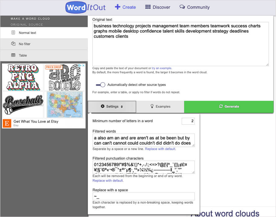 VálasszonTeremtA tetején, majd írja be vagy illessze be a szöveget a dobozba. A szavakat azonnal kiszűrheti aBeállításokopció. Amikor készen állsz, nyomja megElőállíthogy lássa a szófelhőjét.