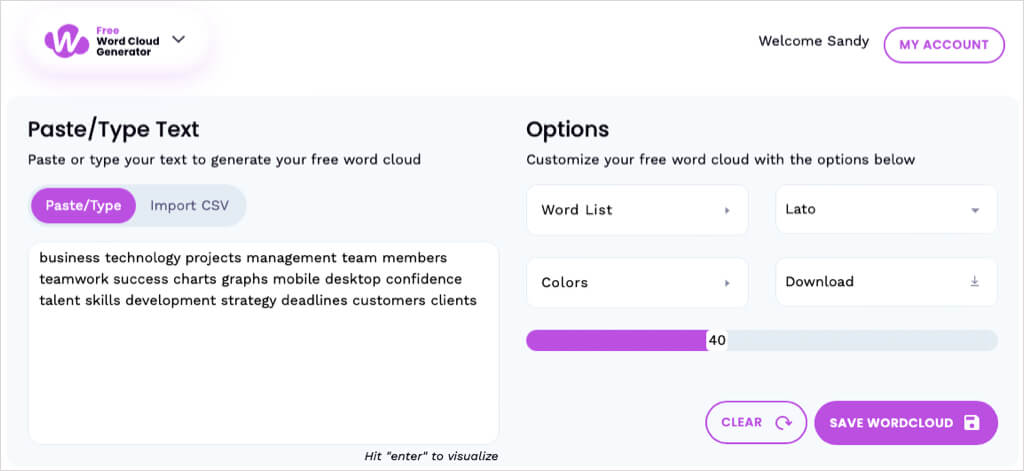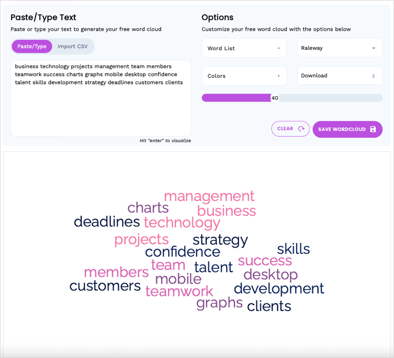 Az induláshoz CSV fájlt beilleszthet, írhat be vagy importál a szövegével. Megjelenik egy alapértelmezett szófelhő, amelyet az alábbi lehetőségekkel testreszabhat.