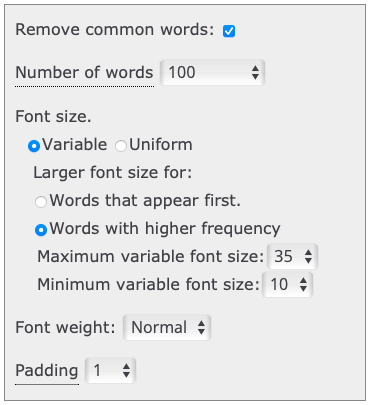 - Kezelje a szólistát a közös szavak eltávolításával, a minimális és a maximális betűtípus méretének kiválasztásával, valamint a betűkészlet súlyának és a párnázásnak a kiválasztásával.