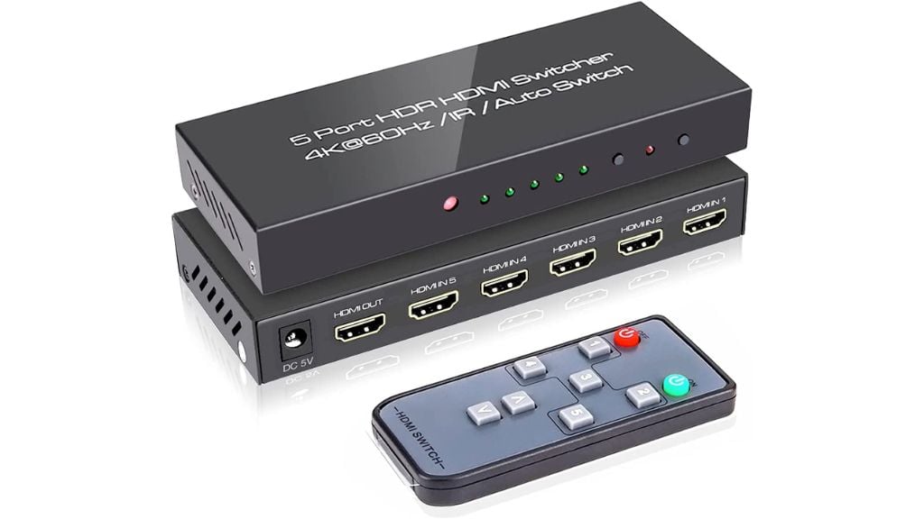 Az 550 milliárd milliárd nagylelkű öt HDMI bemenetből áll, és ez a köteg még egy szép fonott kábellel is rendelkezik, hogy csatlakoztassa a kapcsolót a TV -hez.