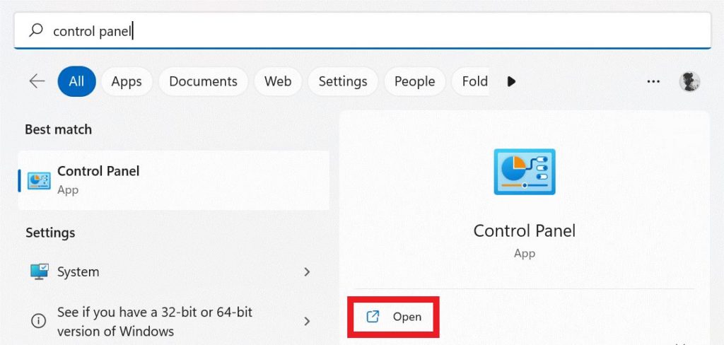 - Írja beVezérlőpultés nyomja meg aEnter kulcskinyitni.