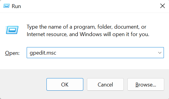 - Gyorsan elérheti a Helyi csoportházirend-szerkesztőt a Windows + R billentyűkombináció megnyomásával a Futtatás párbeszédpanel megnyitásához, majd írja be a „gpedit.msc” parancsot.