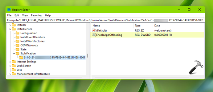 3.Csodálás alatt,Keresse meg fiókjának biztonsági azonosítóját (SID)alapú nyilvántartási al-kulcs. Ennek az al-kulcsnak a jobb oldali ablaktáblájában hozzon létreEnababeAppFOffloadingA regisztrációs DWORD (REG_DWORD) és állítsa be1A SID -t tartó fiók archiválásának engedélyezése.
