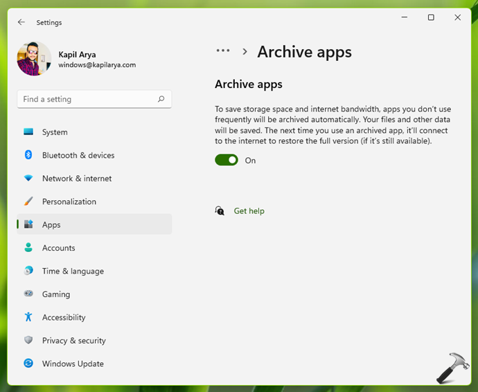 Amikor egy alkalmazás archiválásakor nem használ gyakran használ, az alkalmazás fájljait és adatai mentésre kerülnek az eszközön. Az egyetlen különbség az lesz, hogy amikor a következő alkalommal az alkalmazást választja, a Windows 11 -et le kell töltenie az alkalmazást az internetről vagy az áruházból, feltéve, hogy az alkalmazás elérhető a szállítójától. A Windows 11 -ben engedélyezheti az alkalmazásokat a rendszeren jelenlévő vagy bármely más speciális felhasználói fiókhoz.
