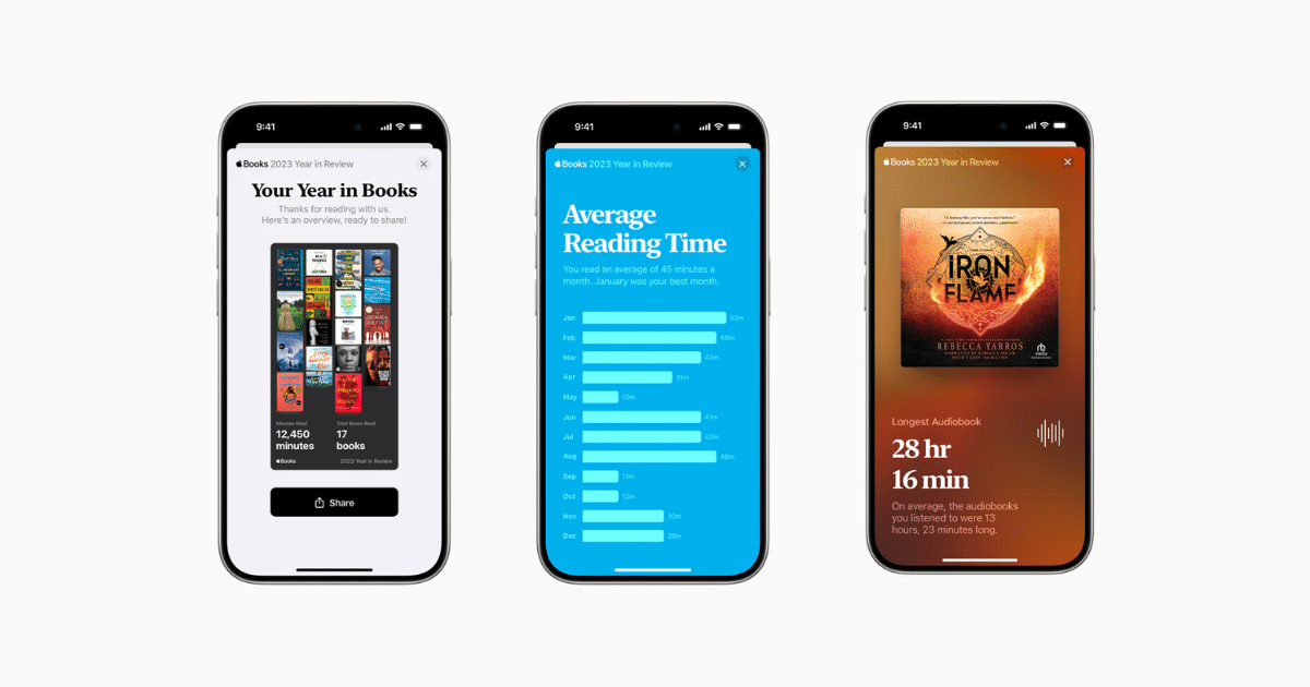 A 2023-as év végéhez közeledve az Apple arra kéri a felhasználókat, hogy gondolják át olvasási szokásaikat az Apple Books személyre szabott „Year in Review” funkcióival. Ez a funkció betekintést nyújt az egyéni olvasási szokásokba, valamint összeválogatja azokat a könyveket, amelyek idén felkeltették az olvasók figyelmét.