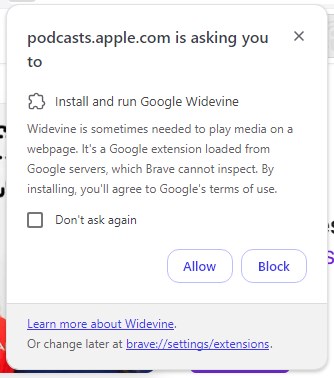 Megjegyzés: Az Apple Podcastokhoz telepíteni kell a Google Widevine beépülő modult a böngészőben, ha nem rendelkezik vele, akkor a lejátszás sikertelen lesz.