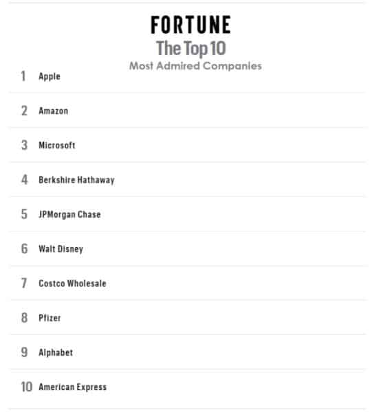P Morgan Chase (5. szám) felülmúlta Walt Disney -t (6. szám) a listán. A Costco, a kiskereskedő, hetedik helyet kapott, majd a Pfizer nyolcadik, a kilencedik ábécé és az American Express tizedik helyén.