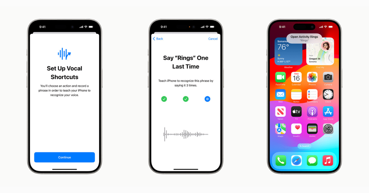 A vokális parancsikonok felhatalmazzák a felhasználókat arra, hogy egyedi kijelentéseket rendeljenek a Siri -hez, lehetővé téve számukra a hivatkozások és az egyszerű hangparancsokkal ellátott feladatok elindítását. Ezenkívül hallgassa meg az atipikus beszédet a gépi tanulással az egyedi beszédminták felismerésére, és a beszédet érintő feltételekkel járó felhasználók számára előnyös, mint például az agyi bénulás, ALS vagy stroke.