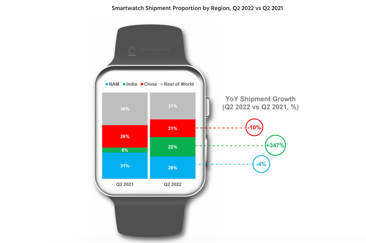 Érdekes módon India először lett a második legnagyobb okosóra-piac. Az indiai piac 300%-os év/év növekedést mutatott a helyi márkák, például a Noise és a Fire-Boltt erőteljes növekedésének köszönhetően, amelyek Apple Watch klónokat árulnak az ár töredékéért.
