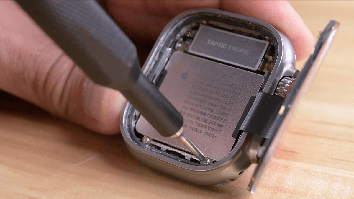 A kijelző alatt az akkumulátor és a taptikus motor néhány csavar távol van. Itt vannak az Apple Watch Ultra lebontásából származó egyéb elvihetőségek a Dyi javíthatósága mellett: