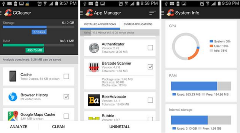 CCleanernem igényel bemutatást. A legjobb tisztító alkalmazás asztali számítógépekhez, Androidra is elérhető. A CCleaner az előzőhöz hasonlóan működik. Elsődleges célja a gyorsítótár ürítése, és a maradék ideiglenes fájlok memóriaterminálja figyeli a telefon erőforrásainak állapotát, például a CPU-t, a RAM-ot stb. Az ideális terminál felismeri azokat az alkalmazásokat, amelyeket már nem fogunk használni, és értesíti, hogy tisztán tartsuk azokat az alkalmazásokat is.