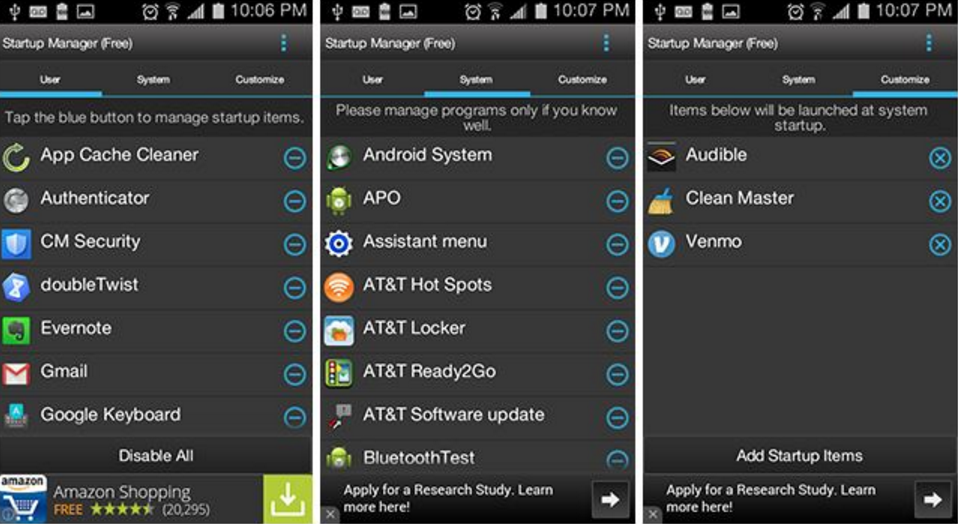 Ez alegjobb Android Startup Manager alkalmazás.Érzékeli az összes olyan alkalmazást, amely a telefon bekapcsolásakor indul el, beleértve a saját rendszeralkalmazásokat és a felhasználói alkalmazásokat is. Ha deaktiválja azokat, amelyek nem szükségesek, akkor a mobil gyorsabban indul el. A legjobb azA Startup Manager ingyenes, és nincs szükség root felhasználóra.