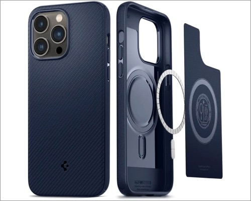 Nem hagyja ki a Magsafe -töltést, mivel az eset mágneses gyűrűvel jár. Szilárd visszacsatolási gombokkal is rendelkezik, amelyek könnyen megnyomhatják és fenntarthatják az iPhone 14 tapintható visszacsatolását. Matt fekete és sötétkék színben kapható.