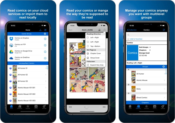 Ez az alkalmazás egy ingyenes manga-képregény olvasó, amely a DRM-mentes képregényeket a CBR/CBZ/PDF fájlokba hozhatja a felhőalapú tárolásból. Tehát olyan képregényeket importál, amelyek már a felhőben van az iPhone -ra vagy az iPadre az offline olvasás érdekében. Ezenkívül felhasználhatja az importált képregények többszintű mappákban történő megszervezésére („Comic Groups” néven).