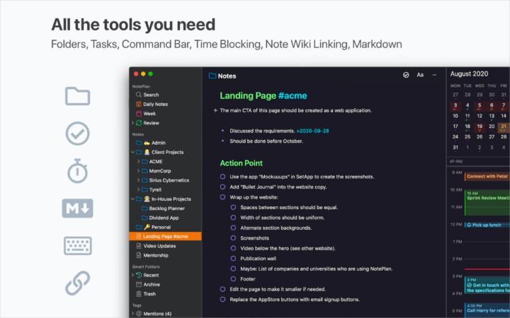 A Noteplan UI emlékeztethet más alkalmazásokat, amelyekkel esetleg találkozhatott. Amikor túljutunk az UI hasonlóságokon, a Noteplan egy olyan alkalmazás, amelyet egy naptár és a Task Manager alkalmazás pótlásának lehet tekinteni, mivel ez az alkalmazás beépült.