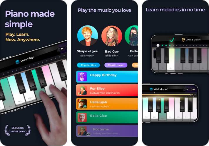 Ezzel az alkalmazással nemcsak zongorázni, hanem gitárt, éneket és ukulelet is megtanulhat. Valósághű hangszereket biztosít több ezer dal elsajátításához.