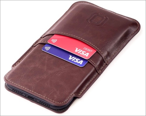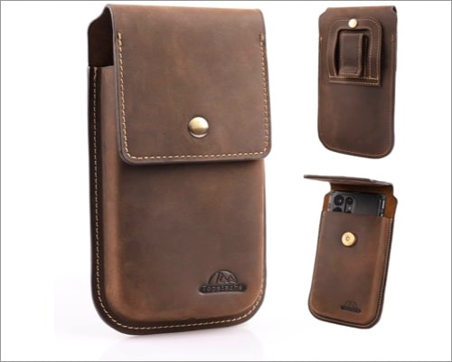 Ez együttesen elhelyezi a telefonját és a védőtokot. Ezt egy erős mágneses kapocs biztosítja az elülső szárnyon. Sőt, a hüvely kiváló minőségű, teljes szemcsés, valódi bőrből készül, a jobb tartósság érdekében, és egy vintage kialakítású, övhurokkal rendelkezik.