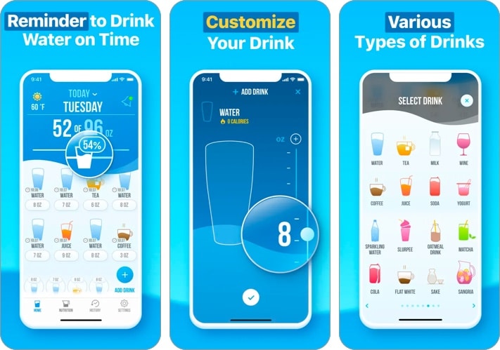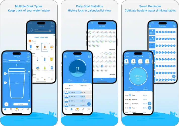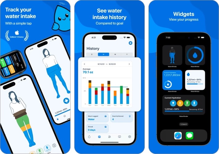 A tiszta vizuális nézet azt mutatja, hogy az aktuális víz kitöltése és több mint 50 karakter működik, hogy tükrözze a hidratációs szintet. A Waterminder támogatja az előre definiált vagy egyedi csésze méretét, a sötét módot, az Apple Health Sync-t, a Siri parancsikonokat és a Widget-t is.