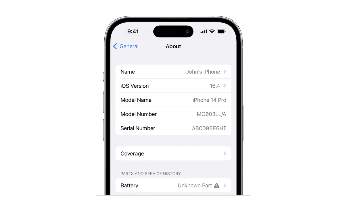 - Ellenőrizze, hogy az alkatrészeket cserélik -e a Beállítások> Általános> Körülbelül. Ha egy alkatrészt kicserélték, akkor a sorozatszám után láthat egy alkatrész- és szolgáltatási előzmények szakaszot.