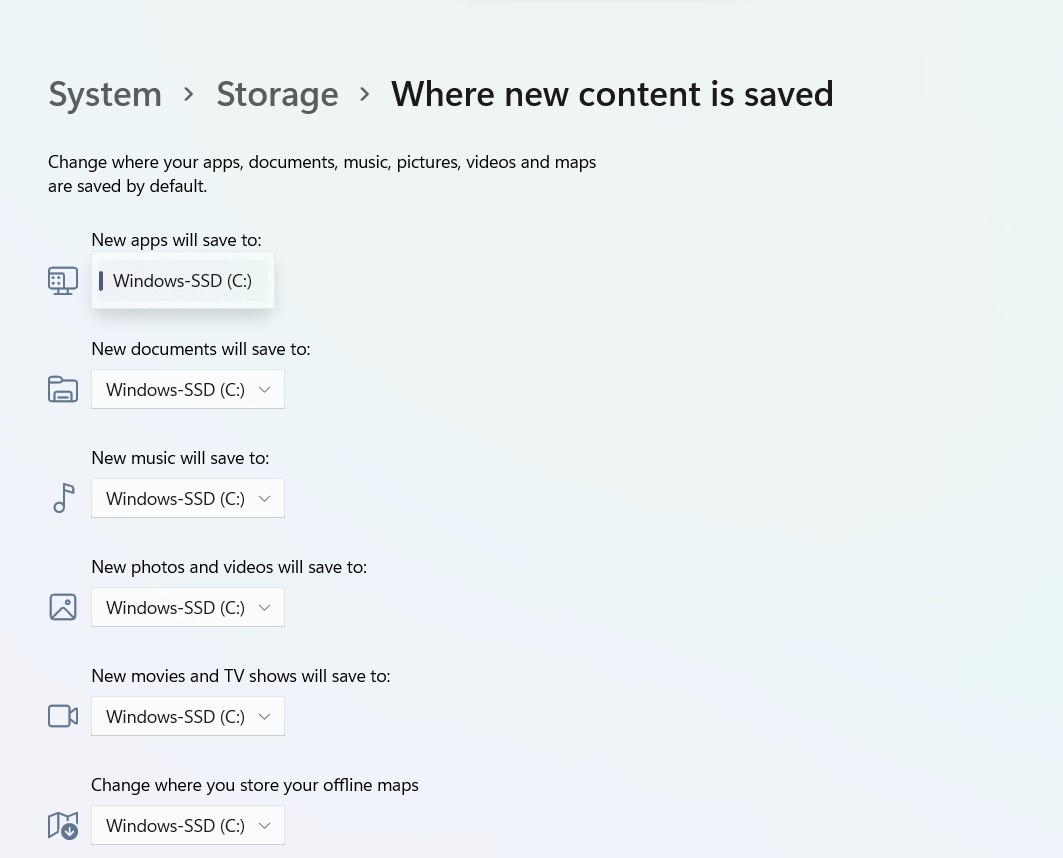 2. lépés - A tároláskezelésben kattintson aSpeciális tárolási beállításokA legördülő menü megnyitásához. VálasszonAhol az új tartalmat mentibenne.