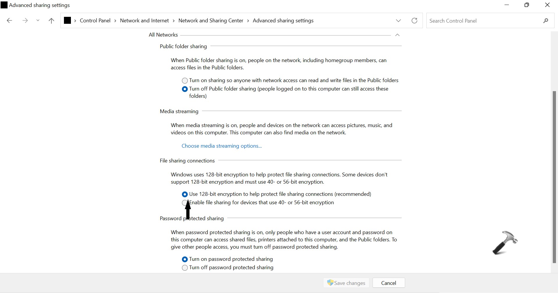 5. Válassza kiHasználjon 128 bites titkosítást a fájlmegosztási kapcsolatok védelméhezvagyEngedélyezze a fájlmegosztást olyan eszközök számára, amelyek 40 vagy 56 bites titkosítást használnakA fájlmegosztó kapcsolatok alatt.